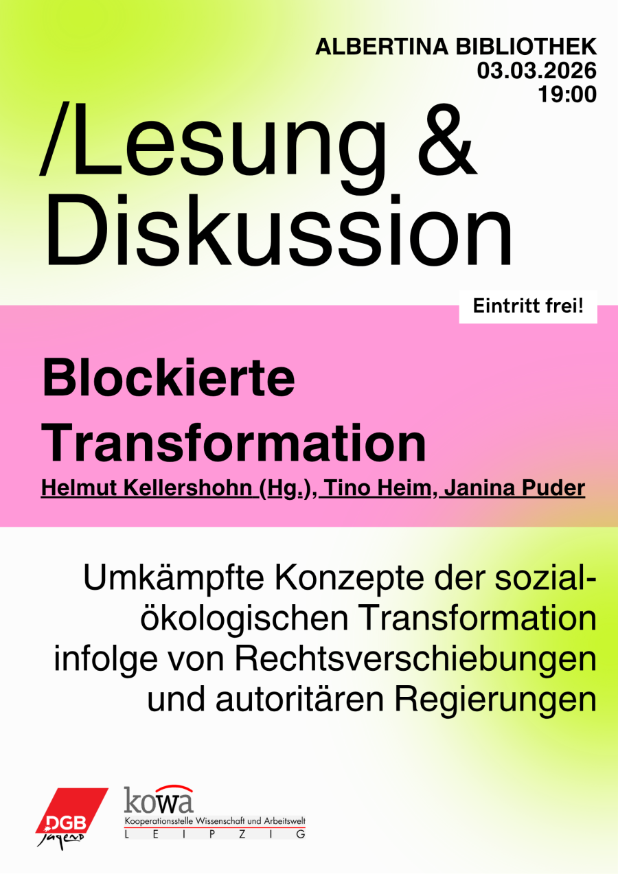 Im Oktober 2025 erschien im Unrast Verlag der von Wolfgang Kastrup und Helmut Kellershohn herausgegebene Sammelband „Blockierte Transformation – Sozial-ökologische Transformationskonflikte und Widerstände – national wie international“. Wir freuen uns sehr in einer gemeinsamen Veranstaltung der DGB-Jugend und der KOWA Leipzig den Band am 3. März 2026 in der Bibliotheca Albertina der Universität Leipzig vorstellen zu dürfen.