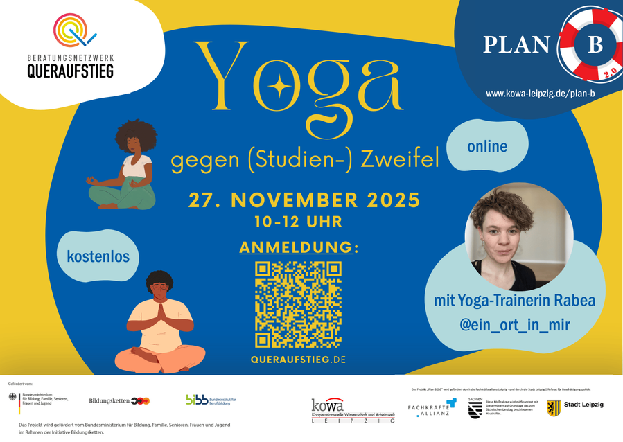 Das Beratungsnetzwerk Queraufstieg Transfer gestaltete am 27.11.2025 gemeinsam mit der Beratungsstelle Plan B 2.0 der Kooperationsstelle Wissenschaft und Arbeitswelt (KOWA) Leipzig den Auftakt zur neuen Online-Veranstaltungsreihe „Yoga gegen (Studien-) Zweifel“. Ziel der Veranstaltung ist es, mit Studierenden über Studienzweifel und Gedanken an Studienabbruch zu sprechen und auf Beratungsangebote zu diesen Themen aufmerksam zu machen. Dabei lädt eine Yoga-Einheit dazu ein, den Zweifeln mit Achtsamkeit, Ruhe und Körperbewusstsein zu begegnen.