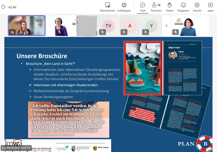 Die Veranstaltungsreihe steht Studierenden aus ganz Deutschland offen. Am Auftakt nahmen 15 Studierende teil. Zu Beginn sprach Eva Hartmann (Systemische Therapeutin und Beraterin von Plan B) mit den Studierenden über Studienzweifel, gab Einblicke in die Beratung durch Plan B im Raum Leipzig und bot Reflexionsansätze aus der Broschüre „Kein Land in Sicht? Neuorientierung bei Studienzweifeln und Studienabbruch“ an.